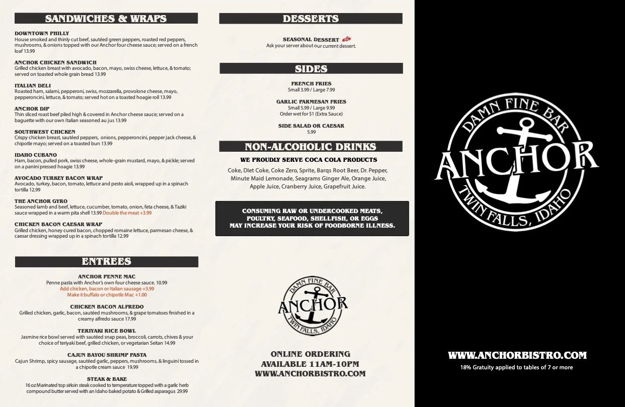 Located in Twin Falls, Anchor Bistro & Bar is a purveyor of fine American bistro fare from fresh, local ingredients.